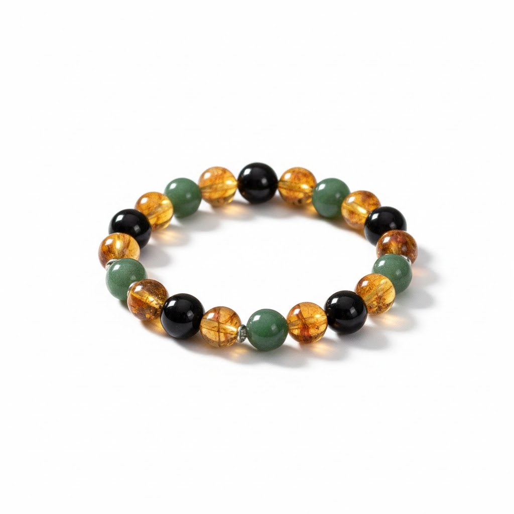 Embrace the perfect harmony of prosperity, luck, and protection. This handcrafted stretch bracelet features high-quality, polished beads of Citrine, Green Aventurine, and Black Onyx. Designed for both men and women, it’s a versatile accessory that brings a touch of earthy elegance to any outfit while keeping your intentions focused.